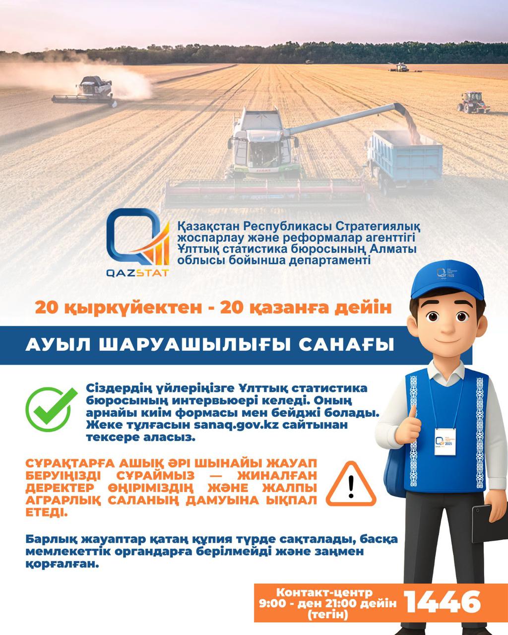 1 тамызда басталған Ауыл шаруашылығы санағы, 20 қазанға дейін жалғасады. Жиналған деректер салаға қатысты мәліметтерді жаңартуға және ауыл шаруашылығын дамытуға арналған шешімдер қабылдауға негіз болады.