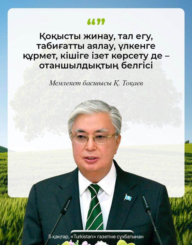 «Қоқысты жинау, тал егу, табиғатты аялау, үлкенге құрмет, кішіге ізет көрсету де — отаншылдықтың белгісі», — деді Қ. Тоқаев.